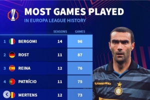 体育资讯9月25日讯 德转统计了欧联(含前身欧洲联盟杯)球员出场数据,贝尔戈米96场成为出场王,雷纳、曾加位居前十。