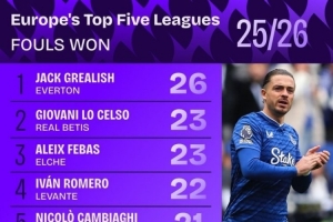 体育资讯10月17日讯 25/26赛季欧洲五大联赛中被犯规次数排名出炉,来自埃弗顿的格拉利什以26次位居第一。