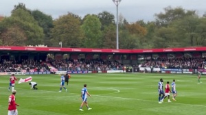 现场视频显示,在这场英乙联赛中,一群男子冲入球场,导致比赛暂停。他们似乎穿着背后印有“加里-内维尔是叛徒”的白色连帽衫,并手持英格兰国旗。其中一名嫌疑人还试图将一面英格兰国旗插在球场中央。安保人员迅速将他们拖离球场,并在比赛暂停期间处理了此事。