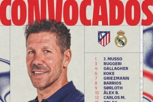 马竞大名单:1-穆索、3-鲁杰里、4-加拉格尔、6-科克、7-格列兹曼、8-巴里奥斯、9-索尔洛特、10-巴埃纳、12-卡洛斯-马丁、13-奥布拉克、14-马科斯·略伦特、15-朗格莱、16-莫利纳、17-汉茨科、18-普比尔、19-阿尔瓦雷斯、20-朱利亚诺-西蒙尼、21-加兰、22-拉斯帕多里、23-尼科-冈萨雷斯、24-勒诺尔芒、26-科斯蒂斯、28-陶菲克、31-埃斯基韦尔