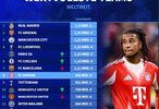 前20名榜单中,英超占11席;西甲和意甲各占3席;德甲2席;法甲1席。