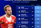凯恩在11场比赛中参与22球高居榜首,姆巴佩和哈兰德分别参与17球和15球分列二三位。