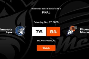 体育资讯9月27日讯 WNBA季后赛半决赛G3,水星84比76击败山猫,大比分2比1领先。