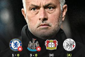 穆里尼奥时隔5年半回归欧冠,遭遇欧冠两连败,先后客负切尔西和纽卡,两度重返英伦均失利,丢4球一球未进。