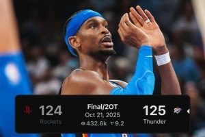体育资讯10月22日讯 在今天结束的NBA揭幕战中,雷霆以125-124战胜火箭。