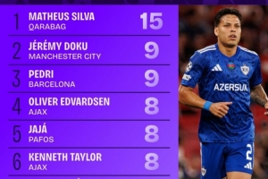 体育资讯10月23日讯 本赛季欧冠联赛阶段已战罢3轮,Squawka统计了到目前为止的被犯规榜单,卡拉巴赫后卫马修斯-席尔瓦15次第一,曼城边锋多库和巴萨中场佩德里均9次,分列二三位。