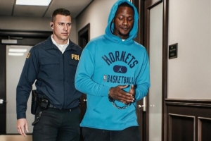 美媒basketballforever晒出了罗齐尔庭审前的照片,他戴着手铐,穿着黄蜂连帽衫。