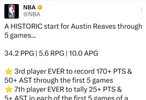 -他是NBA历史上第3位在赛季前5场比赛中,累计得到170+分且送出50+次助攻的球员。前两位分别为17-18赛季的詹姆斯&24-25赛季的约基奇。