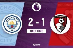 半场结束,曼城2-1伯恩茅斯。