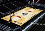 骑士明天主场对阵76人,球场地板已经用上了大家熟悉的配色,真是爷青回了