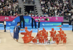 11月12日,在广东省东莞市举行的第十五届全国运动会篮球男子成年组决赛现场,小朋友们带来节目《莞小鹅》萌翻全场。广东队球员赵睿忍不住伸手摸“烧鹅仔”的头,随后露出“姨母笑”。