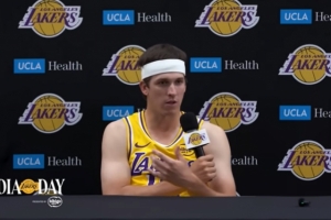 你知道,今天是我自从我们被明尼苏达淘汰后第一次见到他,因为赛季结束后我基本上就“消失”了,我回老家了,而他一直在旅行,每次你见到他,他脸上都带着灿烂的笑容,他是房间里最像大孩子的人,玩得很开心,你知道,对于一位已经征战了这么久的球员来说,你能感受到这一点真的很可贵。