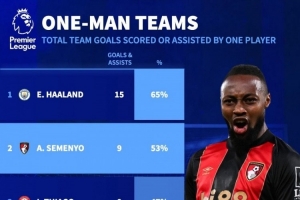 体育资讯11月18日讯 德国转会市场统计了球员本赛季英超参与进球数量占据球队总进球的比例,并列出榜单,哈兰德占比65%最高,塞梅尼奥占比53%第二。